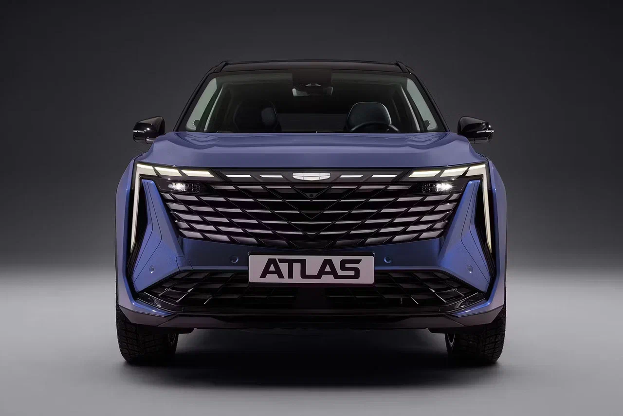 Внешний облик Geely Atlas построен вокруг крупной решетки радиатора с эффектом «бликов на волнах» и узкой светодиодной оптики. Светящийся логотип и горизонтальная светодиодная линия по всей ширине кузова формируют выразительную световую графику. В версии Flagship Sport предусмотрены двухцветная окраска кузова и 20-дюймовые колесные диски.